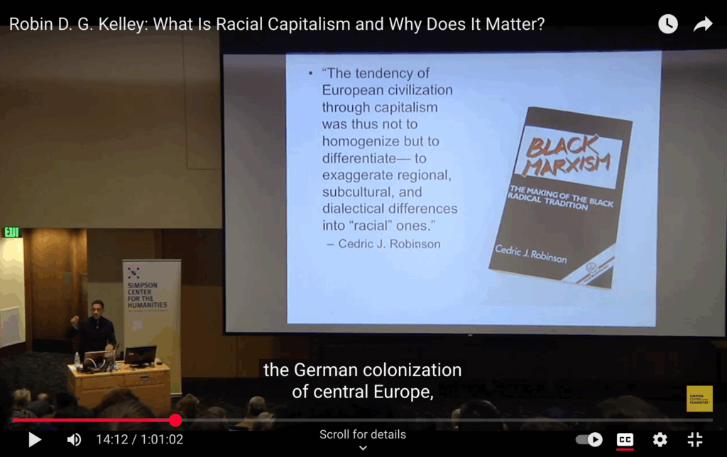 Robin D. G. Kelley, a preeminent US historian, explains racial capitalism and the making of global capitalism over the course of the last 700 years. Kelley then turns to a meditation on fascism, not as an aberration but as a direct outgrowth of modern racial capitalism, and reflects on what all of this means now.